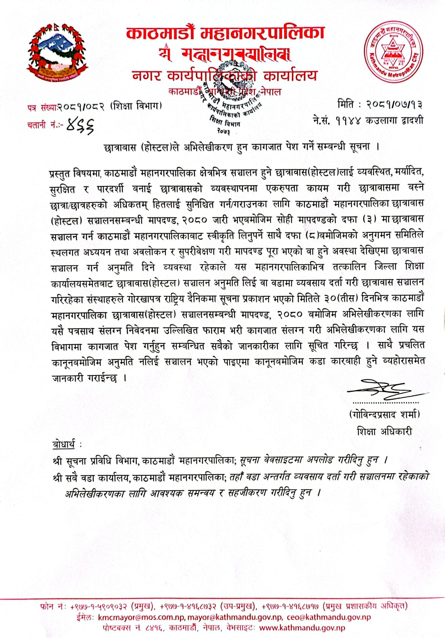 महानगरले “छात्रावास (होस्टल) सञ्चालनसम्बन्धी मापदण्ड, २०८०” अनुसार स्वीकृति र अनुगमनको प्रक्रिया अनिवार्य गरेको छ। यसमा आवश्यक कागजात पेस गर्न ३० दिनको समयसीमा दिइएको छ, र अनुमति बिना सञ्चालन गरिएमा कानुनी कारबाही गरिने चेतावनी सूचनामा उल्लेख छ।